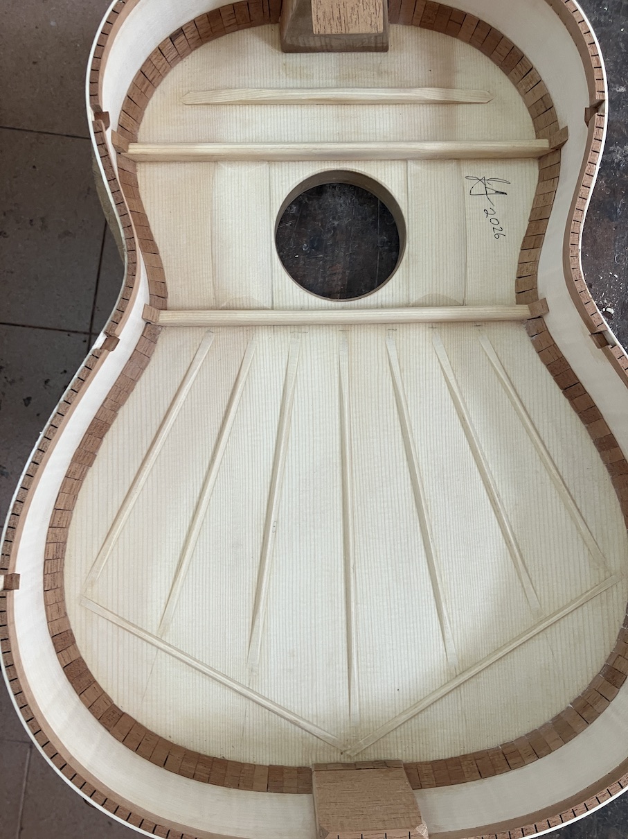 This is the Torres bracing from the copy that I make of SE 153. You will find this pattern in guitars all over the world in slightly different configurations. The angle or “spread” of the fan struts might be widened or narrowed. The closing struts can be eliminated or shortened and as in my concert model the bridge area can be reinforced. Guitars made in Granada almost always use a very traditional construction which means that they are based on Torres or someone who followed Torres.