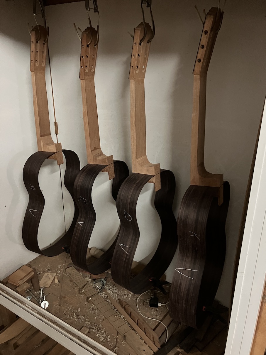 As you may know, I make copies of historic instruments: one of the last guitars made by Antonio de Torres, the Santos Hernández that Segovia owned and donated to the Madrid Library of Music as well as others. This means that at any one time I might be making 4 different styles of guitar in one batch. I looked through my little black book this morning to see when the last time I made 4 concert guitars (no copies) at one time and it was in 2017. And before that was in 2013. I am very happy with this model and usually recommend it to players unless they are looking for a specific sound and aesthetic that the copies might provide. The guitar being played in the video is for sale at DKclassical guitars in Scotland.