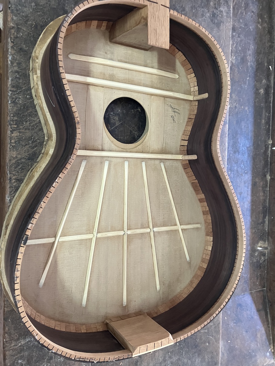 I offer this guitar as my own creation, something that I have developed over the past 30 years. However, as you can see it is very traditional and really nothing new. The five fan struts are very Torres and the very low, thin reinforcement UNDER the fan struts is pure Granada. At the same time the air volume, dimensions and thicknesses have been modified over time to get the best sound possible. I charge more for the historic copies with their added costs and special decorations but this is the guitar that I am constantly trying to improve and so is the one that I tend to recommend.